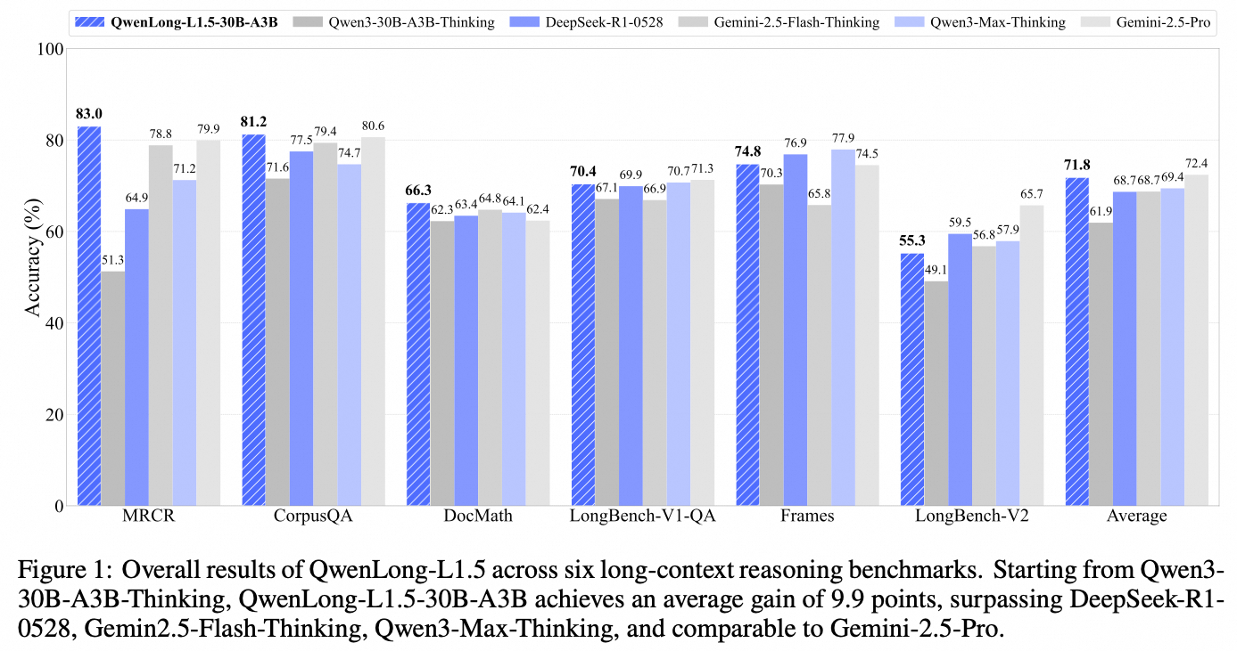 Our comprehensive evaluation on leading long-context benchmarks shows that QwenLong-L1.5 surpasses its Qwen3-30B-A3B-Thinking baseline by an average of 9.9 points, achieving performance comparable to top-tier models like GPT-5 and Gemini-2.5-Pro. Crucially, these enhancements also translate to significant gains in general domains like mathematics, tool-use, and long-dialogue scenarios, demonstrating that strong long-context ability provides a foundational boost to a model's overall reasoning capabilities.