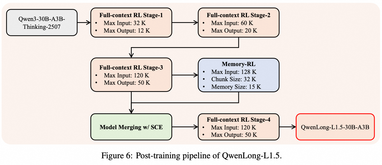 In this work, we introduce QwenLong-L1.5, a long-context reasoning model built upon Qwen3-30B-A3B-Thinking, augmented with memory mechanisms to process tasks far beyond its physical context window. Our core contribution is a full post-training recipe that unifies data synthesis, training methodologies, and agent architectures.